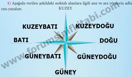 1) Aşağıda verilen şekildeki noktalı alanlara ilgili ana ve ara yönlerin adlarını yazalım.
