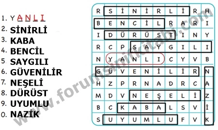 Soru : Bulmacada olumlu ve olumsuz bazı tutum ve davranış ifadeleri gizlenmiştir. Bu ifadeleri yukarıdan aşağıya ya da soldan sağa olacak şekilde bulunuz. Baş harfine ve harf sayısına göre uygun alana yazınız.