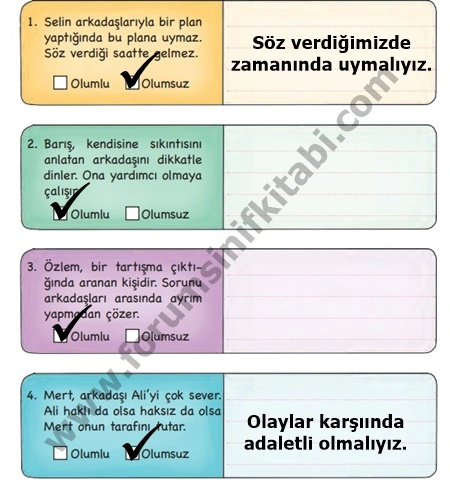 Soru : Aşağıdaki davranışların arkadaşlık ilişkilerini nasıl etkileyeceğini ilgili kutuyu boyayarak belirtiniz. Olumsuz davranışların yanına bu davranışların olumlu olması için öneriler yazınız.
