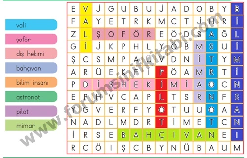 1- Aşağıdaki mesleklerin adları bulmacada gizlenmiştir. Bu kelimeleri bularak örnekteki gibi boyayınız.