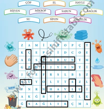 Soru : Aşağıdaki bulmacaya “Temizlik ve Hijyen Kurallarına Uyalım” konusunda geçen bazı sözcükler soldan sağa, yukarıdan aşağıya doğru yerleştirilmiştir. Bulmacaya yerleştirilen sözcükleri bularak işaretleyelim.