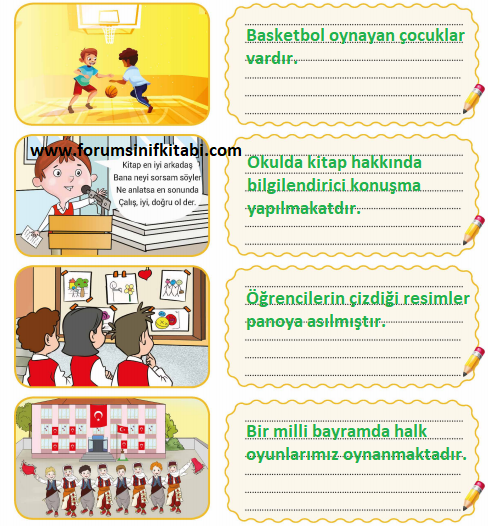Soru: Aşağıdaki görsellerde okullarda yapılan sosyal ve kültürel etkinliklerden bazılarım görmektesiniz. Görselleri inceleyerek bu etkinliklerde hangi çalışmaların yapıldığını yanlarındaki alanlara yazınız.