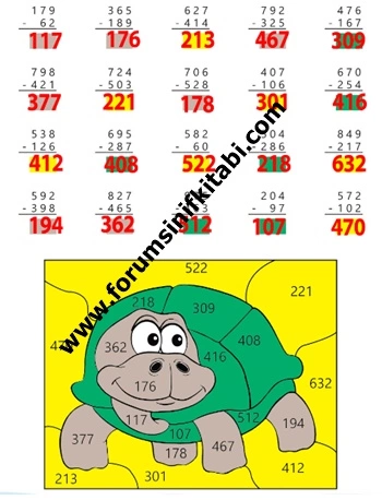 4) Aşağıdaki çıkarma işlemlerini yapınız. İşlem sonuçlarını yazdığınız kutuların rengine göre aşağıdaki resimde sayıların bulunduğu alanı boyayınız.