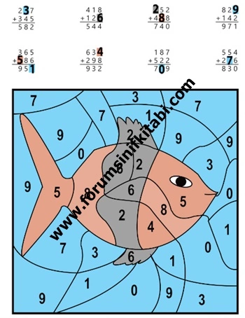 3) Aşağıdaki toplama işlemlerinde verilmeyen rakamları bulunuz. Rakamları yazdığınız kutuların rengine göre aşağıdaki resimde rakamların bulunduğu alanları boyayınız.