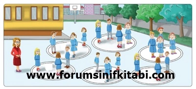 1) Öğretmen, 20 öğrencisini bahçede oyun oynamaya çıkarıyor. Öğrencileri görseldeki gibi 5 daireye eşit sayıda dağıtıyor. Görseli inceleyiniz.