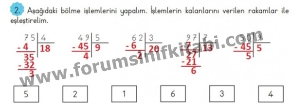 2. Aşağıdaki bölme işlemlerini yapalım. İşlemlerin kalanlarını verilen rakamlar ile eşleştirelim.