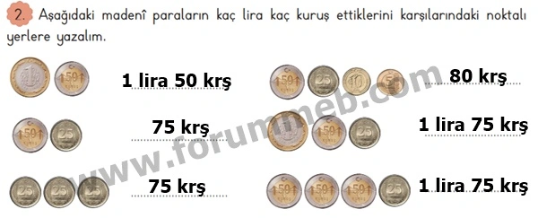 2. Aşağıdaki madenî paraların kaç lira kaç kuruş ettiklerini karşılarındaki noktalı yerlere yazalım.
