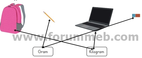 1. Aşağıdaki nesneleri ölçmek için “gram” veya “kilogram” birimlerinden hangisi kullanılır? Karşılarına yazalım.