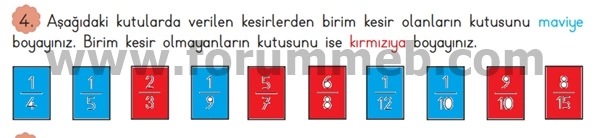 4. Aşağıdaki kutularda verilen kesirlerden birim kesir olanların kutusunu maviye boyayınız. Birim kesir olmayanların kutusunu ise kırmızıya boyayınız.