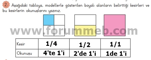 2. Aşağıdaki tabloya, modellerle gösterilen boyalı alanların belirttiği kesirleri ve bu kesirlerin okunuşlarını yazınız.
