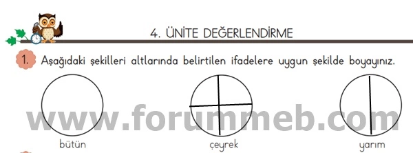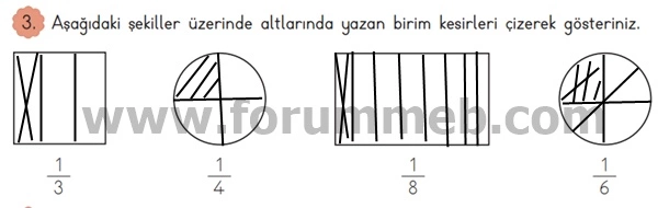 3. Aşağıdaki şekiller üzerinde altlarında yazan birim kesirleri çizerek gösteriniz.