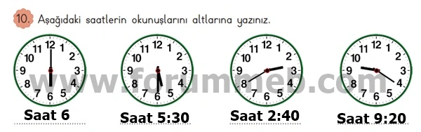 10. Aşağıdaki saatlerin okunuşlarını altlarına yazınız.