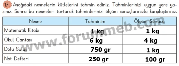 17. Aşağıdaki nesnelerin kütlelerini tahmin ediniz. Tahminlerinizi uygun yere yazınız. Sonra bu nesneleri tartarak tahminlerinizi ölçüm sonuçlarınızla karşılaştırınız.