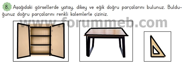 8. Aşağıdaki görsellerde yatay, dikey ve eğik doğru parçalarını bulunuz. Bulduğunuz doğru parçalarını renkli kalemlerle çiziniz.