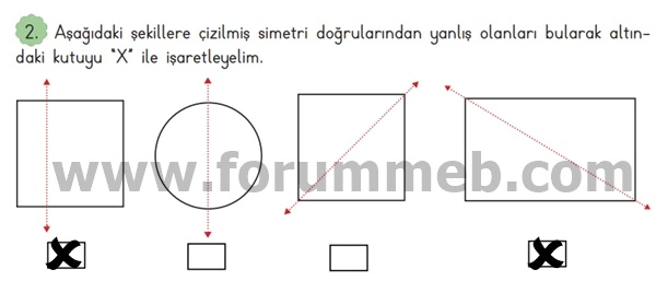 2. Aşağıdaki şekillere çizilmiş simetri doğrularından yanlış olanları bularak altındaki kutuyu “X” ile işaretleyelim.