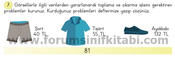 7. Görsellerle ilgili verilerden yararlanarak toplama ve çıkarma işlemi gerektiren problemler kurunuz. Kurduğunuz problemleri defterinize yazıp çözünüz.