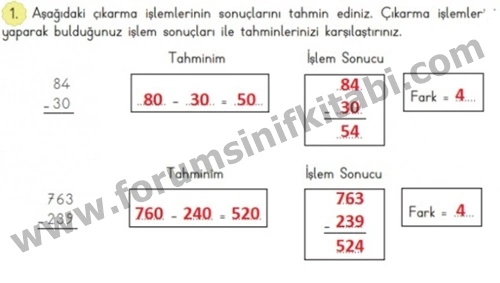 1. Aşağıdaki çıkarma işlemlerinin sonuçlarını tahmin ediniz. Çıkarma işlemlerini yaparak bulduğunuz işlem sonuçları ile tahminlerinizi karşılaştırınız.