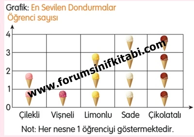 1. Esin, sınıf arkadaşlarına en sevdikleri dondurma çeşitlerini sormuş ve elde ettiği verilerle aşağıdaki nesne grafiğini oluşturmuştur.