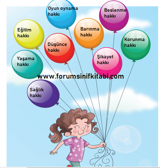 Soru: 1. Çocuk olarak sahip olduğunuz hakları aşağıdaki balonlara yazınız. (Bu konuda, aile büyüklerinizden yardım alabilir, internet vb. kaynaklardan yararlanabilirsiniz.)