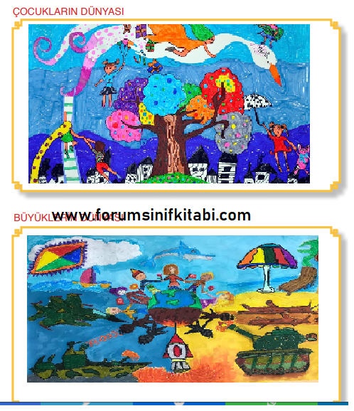 Soru: A) “Oyun İster Bazen Büyükler” şarkısına göre çocukların ve büyüklerin dünyalarında neler vardır? Şarkıyı bir daha dinleyip hissettiklerinizin resmini çiziniz.