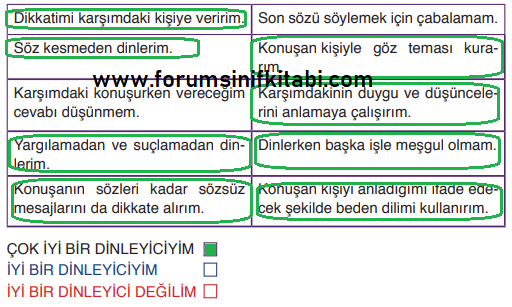 Soru: Birini dinlerken aşağıdakilerin hangilerini uyguluyorsunuz? İşaretleyiniz. İşaretlediklerinizi dikkate alarak iyi bir dinleyici olup olmadığınız konusundaki düşüncenizi uygun kutucuğa “X” işareti koyarak belirtiniz.