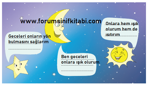 Soru: Aşağıda, Güneş, Ay ve Kutup Yıldızı kendi aralarında kimin insanlık için daha yararlı olduğunu tartışıyor. Konuşma balonlarını bu tartışma doğrultusunda doldurunuz.