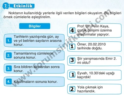 Soru : Noktanın kullanıldığı yerlerle ilgili verilen bilgileri okuyalım. Bu bilgileri örnek cümlelerle eşleştirelim.