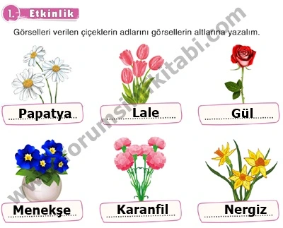 Soru : Resimleri verilen çiçeklerin adlarını altlarına yazalım.