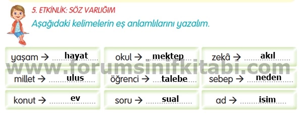 Soru : Aşağıdaki kelimelerin eş anlamlılarını yazalım.