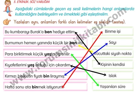 Soru : Aşağıdaki cümlelerde geçen eş sesli kelimelerin hangi anlamlarda kullanıldığını belirleyelim ve örnekteki gibi eşleştirelim.