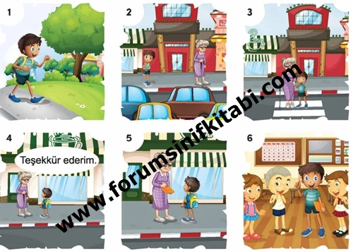 Bir gün bir çocuk okula gidiyormuş. Yolda bir yaşlı kadın görmüş. Daha sonra ise yaşlı kadına  yoldan geçmesine yardım etmiş. Daha sonra ise yaşlı kadın bu davranışına karşı çocuğa teşekkür etmiş. Daha sonra ise ona öğüt vermiş. Daha sonra ise arkadaşları ile bunu paylaşmış.