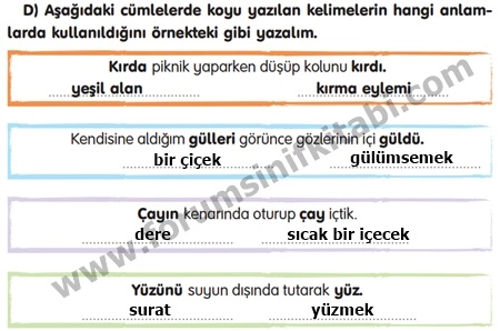 D) Aşağıdaki cümlelerde koyu yazılan kelimelerin hangi anlamlarda kullanıldığını örnekteki gibi yazalım.