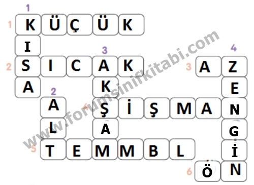 SOLDAN SAĞA 1. Büyük. 2. Soğuk. 3. Çok. 4. Zayıf. 5. Çalışkan. 6. Arka.