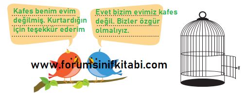 Soru: 1. Aşağıdaki kafesi gören kuşların bu kafesle ilgili neler konuşuyor olabileceklerini konuşma balonlarına yazınız.