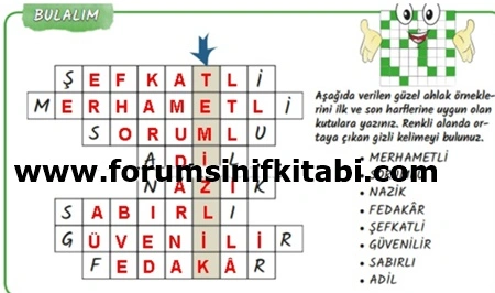 Soru : Aşağıda verilen güzel ahlak örneklerini ilk ve son harflerine uygun olan kutulara yazınız. Renkli alanda ortaya çıkan gizli kelimeyi bulunuz.