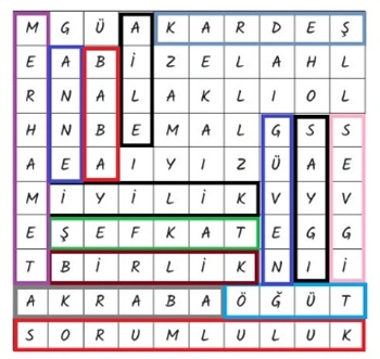 Soru : Aşağıdaki kelime avını çözüp, kalan harflerle gizli olarak verilen mesajı bulunuz.