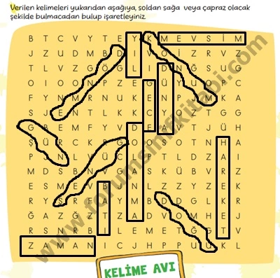 Soru : Verilen kelimeleri yukarıdan aşağıya, soldan sağa veya çapraz olacak şekilde bulmacadan bulup işaretleyiniz.