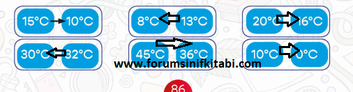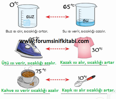 Soru: Aşağıda çeşitli maddelerin sıcaklıkları verilmiştir. Maddeler birbirine temas ettiğinde meydana gelecek olan ısınma – soğuma değişimlerini örnekteki gibi yazınız