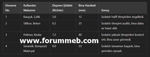 Deneme sonuçlarına göre, Polimer ve Kevlar karışımı malzeme ile yapılan izolatörlerin en iyi sonucu verdiği gözlemlendi. Bu malzeme, yüksek titreşimleri etkili bir şekilde absorbe ederek binanın zarar görmesini engelledi. Bu çözüm önerisi, malzeme, zaman ve maliyet açısından en uygun seçenek olarak belirlendi.