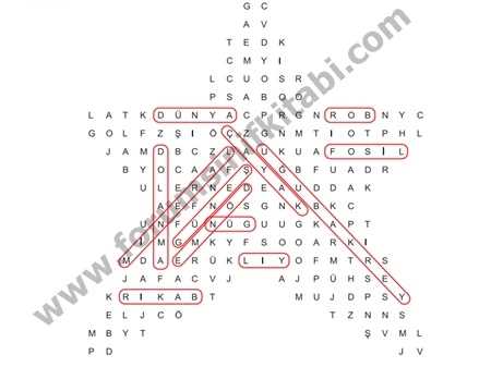 F) Aşağıdaki yıldızın içerisinde ünite boyunca işlediğimiz konularla ilgili kavramlar bulunmaktadır. Sözcükler; soldan sağa, yukarıdan aşağıya ve çapraz olarak harflerin içine karıştırılmıştır. Aşağıdaki sözcükleri karışık olarak verilmiş harfler içerisinden bulunuz. Bulduğunuz sözcükleri renkli kalemler ile çiziniz.