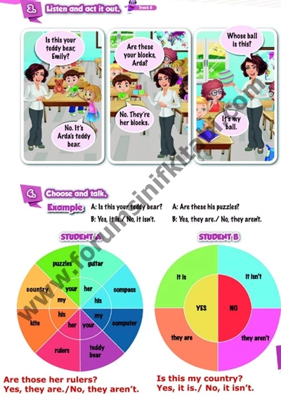 Whose teddy bear is this? = It’s Melis’s teddy bear.