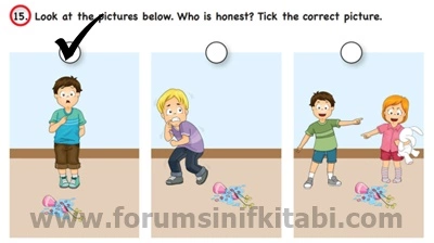 15. Look at the pictures below. Who is honest? Tick the correct picture.