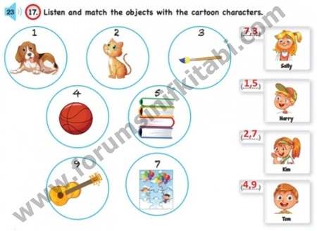 17. Listen and match the objects with the cartoon characters.