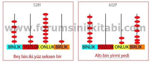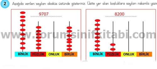 3) Aşağıda verilen sayıları abaküs üstünde gösteriniz. Altta yer alan boşluklara sayıların okunuşlarını ve basamak isimlerini yazınız.