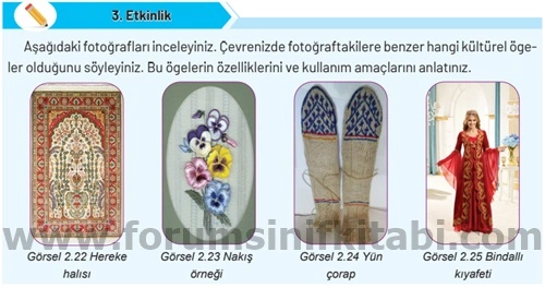 Soru : Aşağıdaki fotoğrafları inceleyiniz. Çevrenizde fotoğraftakilere benzer hangi kültürel ögeler olduğunu söyleyiniz. Bu ögelerin özelliklerini ve kullanım amaçlarını anlatınız.