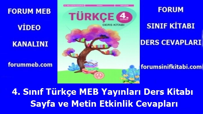 Değerli ziyaretçilerimiz ; ilkokul eğitim öğretim yılında “4. Sınıf Türkçe Ders Kitabı Cevapları MEB Yayınları” konusuyla beraber Türkçe Ders Kitabı metin etkinlik ödevlerinizi kontrol etmeniz amacıyla Türkçe Öğretmenimiz tarafından sizler için aşağıda sayfa sayfa olarak hazırlanmıştır.