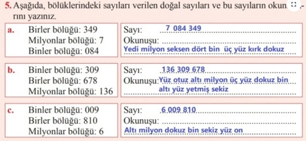 5. Aşağıda, bölüklerindeki sayıları verilen doğal sayıları ve bu sayıların okunuşlarını yazınız.