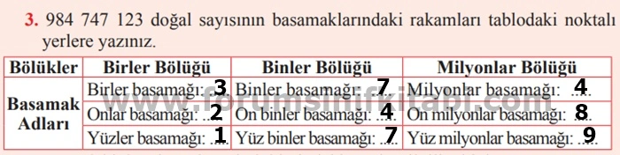 3. 984 747 123 doğal sayısının basamaklarındaki rakamları tablodaki noktalı yerlere yazınız.