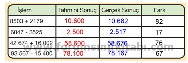 Tahmininizi gerçek sonuç ile karşılaştırınız. Tahmininiz gerçek sonuçtan eksik mi çıktı, yoksa fazla mı? Tahmin yaparken hangi yöntemi kullandınız? Arkadaşlarınıza açıklayınız.