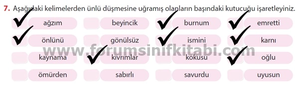 7. Aşağıdaki kelimelerden ünlü düşmesine uğramış olanların başındaki kutucuğu işaretleyiniz.